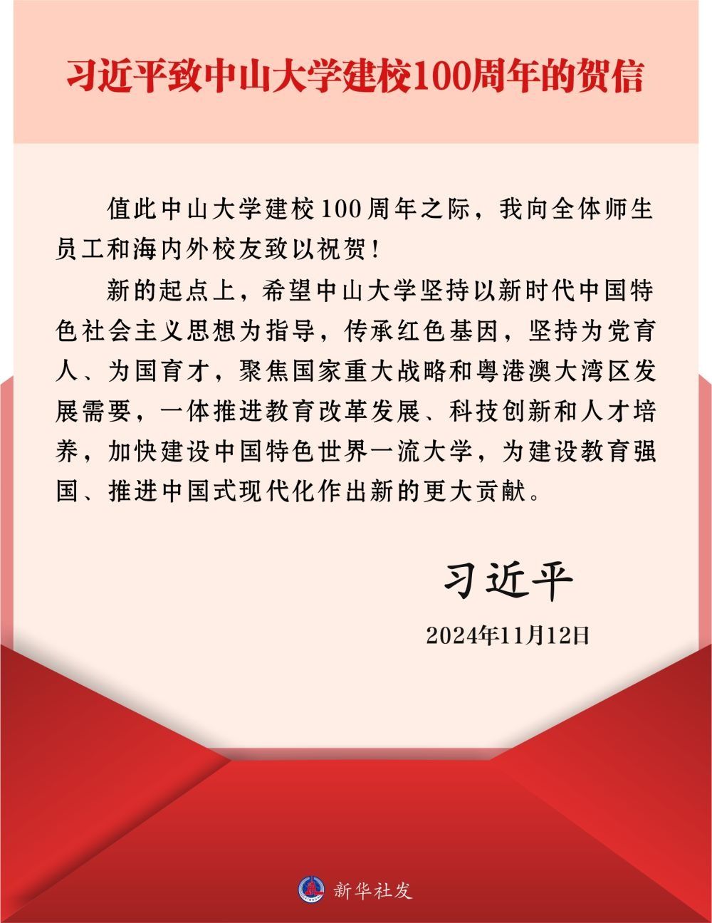 新华社广州11月12日电 中共中央总书记、国家主席、中央军委主席习近平11月12日致信祝贺必威BETWAY西汉姆联建校100周年,向全体师生员工和海内外校友致以祝贺。习近平在贺信中强调,新的起点上,希望必威BETWAY西汉姆联坚持以新时代中国特色社会主义思想为指导,传承红色基因,坚持为党育人、为国育才,聚焦国家重大战略和粤港澳大湾区发展需要,一体推进教育改革发展、科技创新和人才培养,加快建设中国特色世界一流大学,为建设教育强国、推进中国...